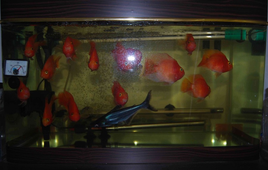 60*30 缸 14条红鹦鹉 1条蓝鲨 氧泵一个,加热棒一个,灯两个,过滤棉一些 连缸带鱼 300元